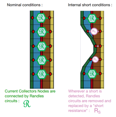 Battery modeling has been introduced in the EM solver in order to simulate battery cells under normal use conditions as well as during abusive scenarios where the battery cells are damaged and shorts can occur. The thinness of the different components of a unit cell (anode/cathode, separator, current collectors) makes battery modeling a challenge for each of the different physics involved (EM, mechanical, thermal) especially in impact and short cut scenarios. On the EM side, the challenge will consist in modeling the chemical reaction of ions moving in electrolyte. The EM solver uses the so called Randles circuits i.e equivalent circuit models to represent battery electrochemical reactions.