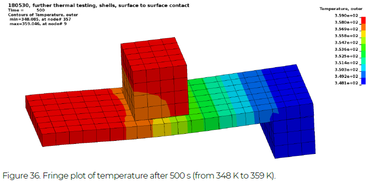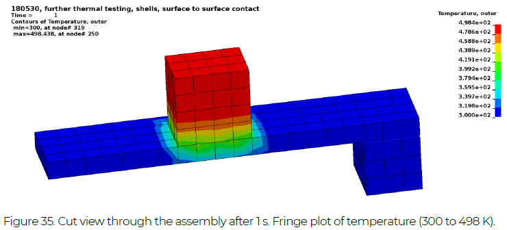 A flat panel is fully constrained at one edge, see Figure 34. The initial temperature of the moving block (yellow in Figure 34) is 500 K, while all other parts have an initial temperature of 300 K. First, the moving block is placed on the panel (by gravity) for a duration of 100 s, then a motion is applied to close the contact with the fixed block (blue in Figure 34). For more details on thermal contacts, see Section 6.1.8. The temperature distribution after 1 s is shown in Figure 35 (cut view) and after 500 s in Figure 36. Note that the shell thickness is also visualized in these images, and that the fringe limits differ.