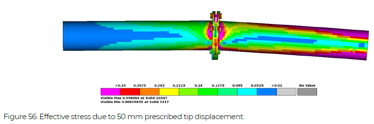 The same bolted joint as in Section 12.1.2 is studied, but in this case the pre-tensioning (pretens001.key) is followed by a prescribed transverse displacement of 50 mm (full_restart.key). The stress result is shown in Figure 56, and the moment vs. tip displacement curve is shown in Figure 55.