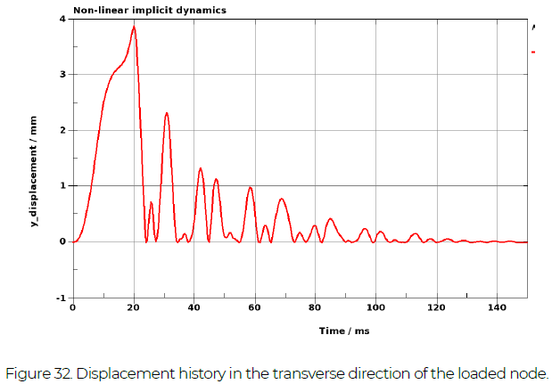 This example is very similar to the one of Section 4.6.1, but a fully constrained, rigid transverse support (green in Figure 31) is added. Loads and boundary conditions are the same as in Section 4.6.1. A contact condition is defined between the support and the beam using *CONTACT_AUTOMATIC_SURFACE_TO_SURFACE_MORTAR. A frequency-independent (for the range 50 – 300 Hz) damping of 3 % of critical is applied using *DAMPING_FREQUENCY_RANGE. Moderate numerical damping is also applied by using GAMMA = 0.55 and BETA = 0.27563. The transient displacement response of the loaded node is shown in Figure 32. The response is quite chaotic at the beginning, but decays quickly due to the combined effect of the damping definitions.