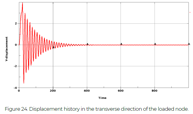 An L-shaped beam is loaded by a transverse, transient (triangular) loading, see Figure 23. A constant modal damping of 3 % is applied. The transient displacement response of the loaded node is shown in Figure 24. The example keyword file is transient001.key.