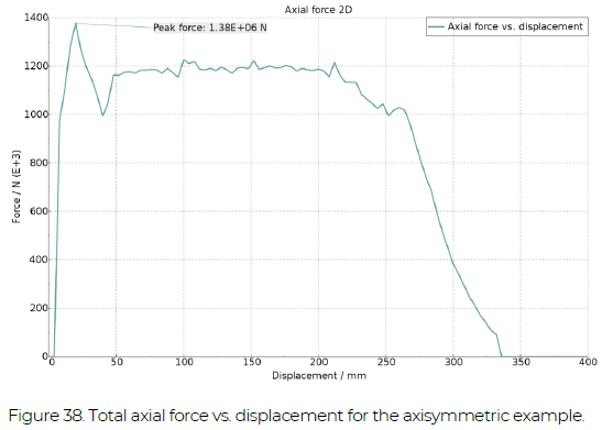 An elastic steel cone is inserted into a tube (σY = 580 MPa) with variable diameter using prescribed motion [16], see Figure 37. The analysis is performed using non-linear statics, and the control cards of control_cards_nonlin.key. Since the displacement in this case is quite large (400 mm), the solution control was modified, setting DNORM = 1 on *CONTROL_IMPLICIT_SOLUTION. A total of 809 axisymmetric solid elements (shell element formulation 15) are used. The example keyword file is run_2d.key (NOTE that this example should be run in smp/LS-DYNA double precision. From R14, mpp/LS-DYNA can also be used). The axial force-displacement curve is shown in Figure 38. Note that in axisymmetric analyses, reported forces should be multiplied by 2pi to obtain the total force.